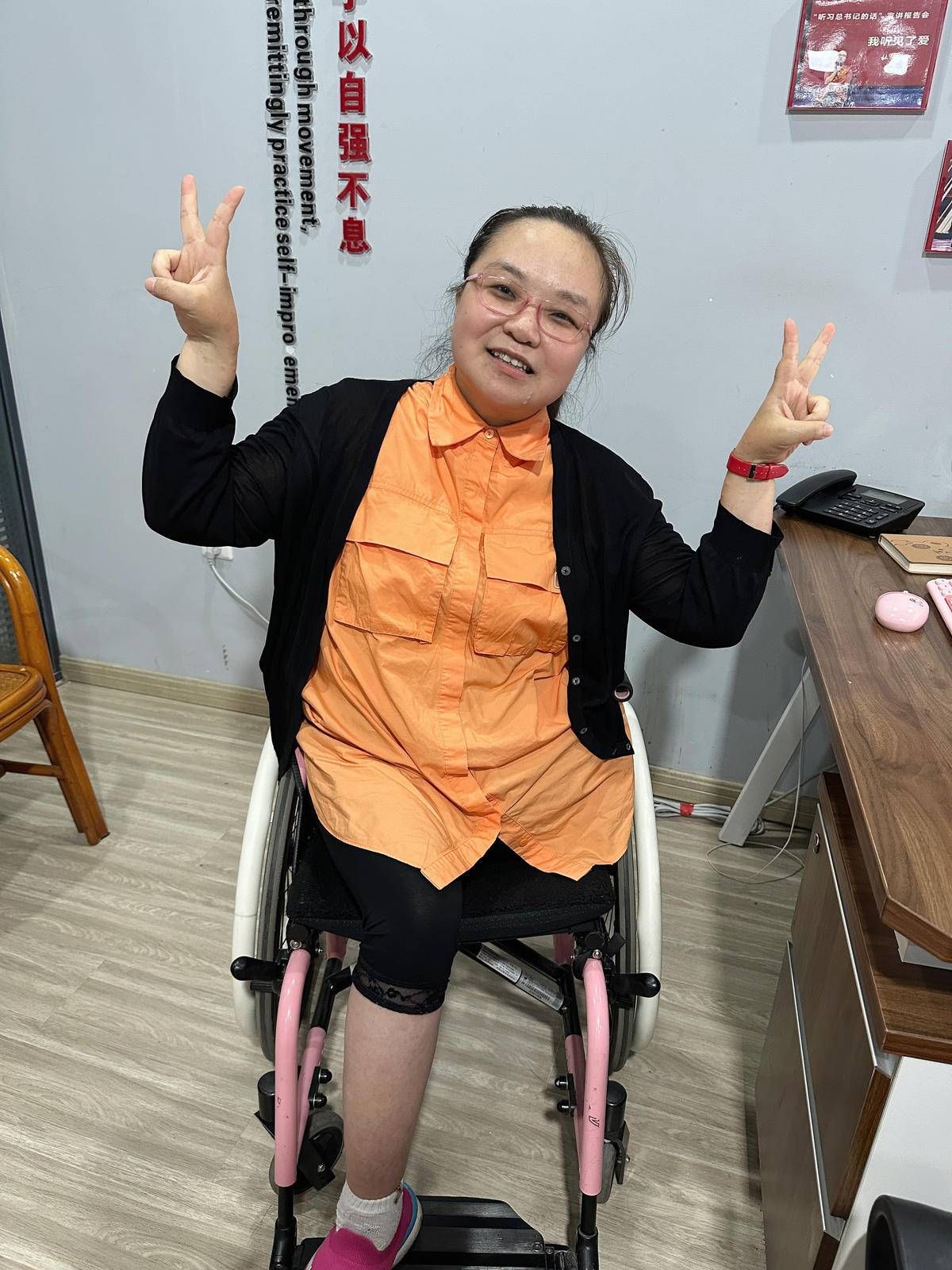 采访中,杜诚诚不时开怀大笑,阳光开朗、活力满满。她的鼠标、键盘、水杯、轮椅,甚至连垃圾桶都是可爱的粉色。