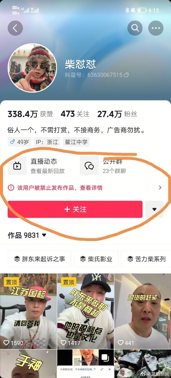 5月3日下午,“柴怼怼”抖音平台账号显示“该用户被禁止发布作品”。