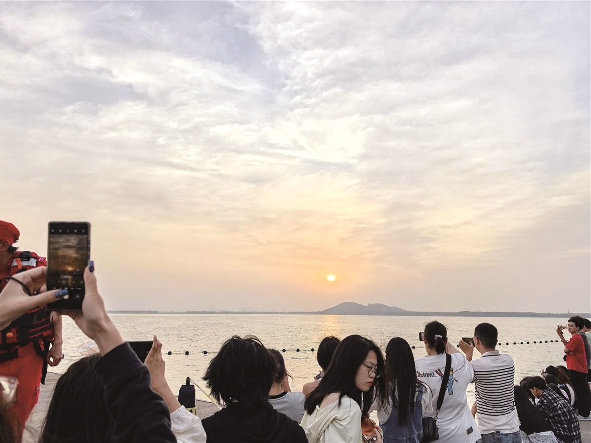 5月3日,游客在东湖凌波门看日出