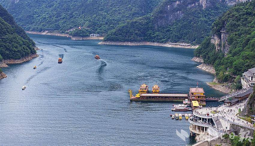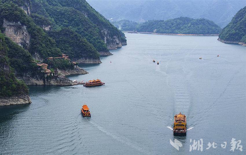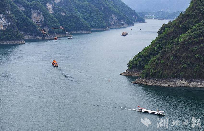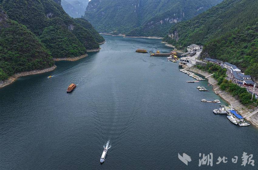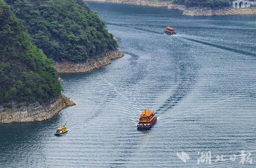 5月3日,鸟瞰位于长阳土家族自治县境内的清江隔河岩水库,镜头下清江碧波荡漾,一条条过往的船只络绎不绝,激起一圈圈洁白的浪花。