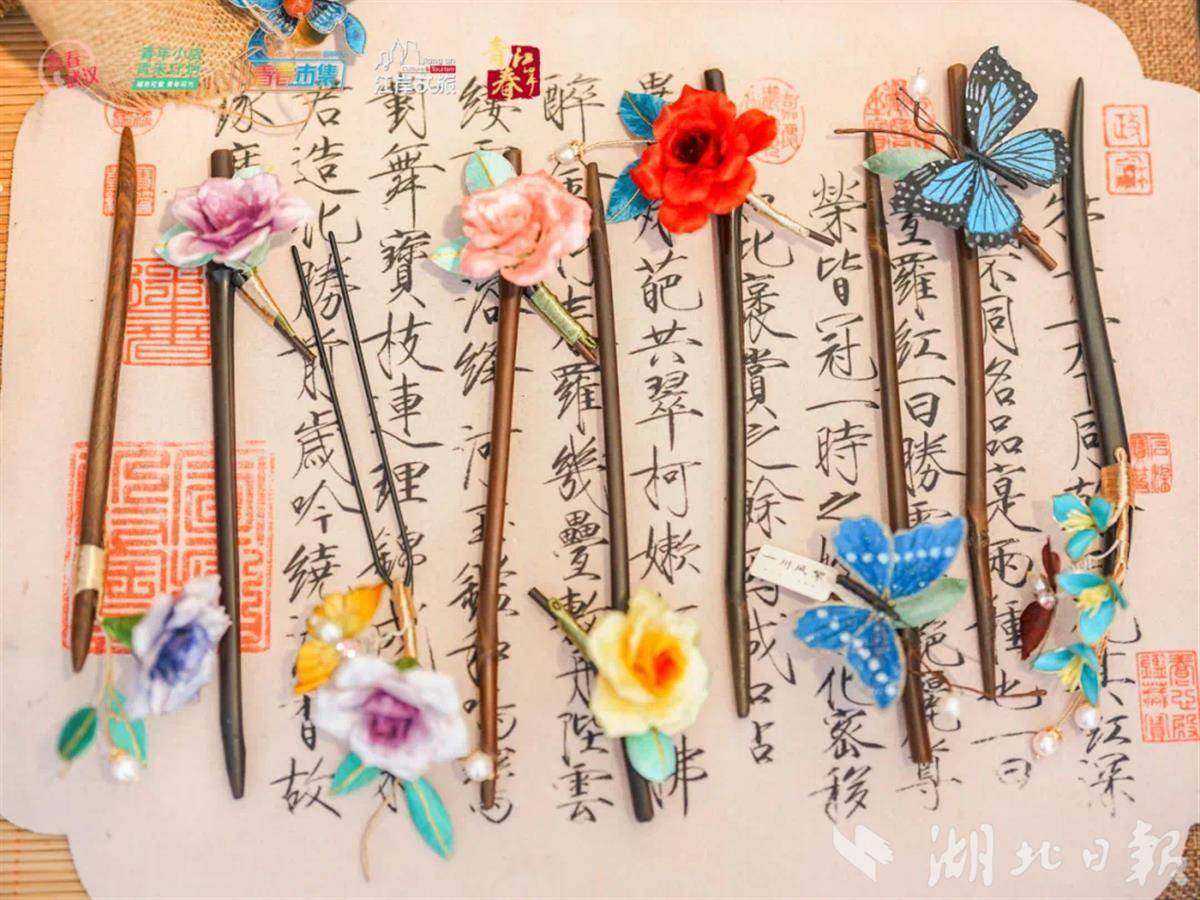 湖北工业大学轻工技术与工程专业学生刘源的摊位同样引人注目。她以非遗绒花手作为核心,展示以蚕丝线为原料制作的精美绒花饰品。刘源结合轻工技术专业背景,优化绒花染色工艺与造型设计,既保留传统韵味,又融入现代审美。“每一朵绒花都是中华文化的缩影,我们要让非遗‘活’在当下,走进年轻人的生活。”她说。