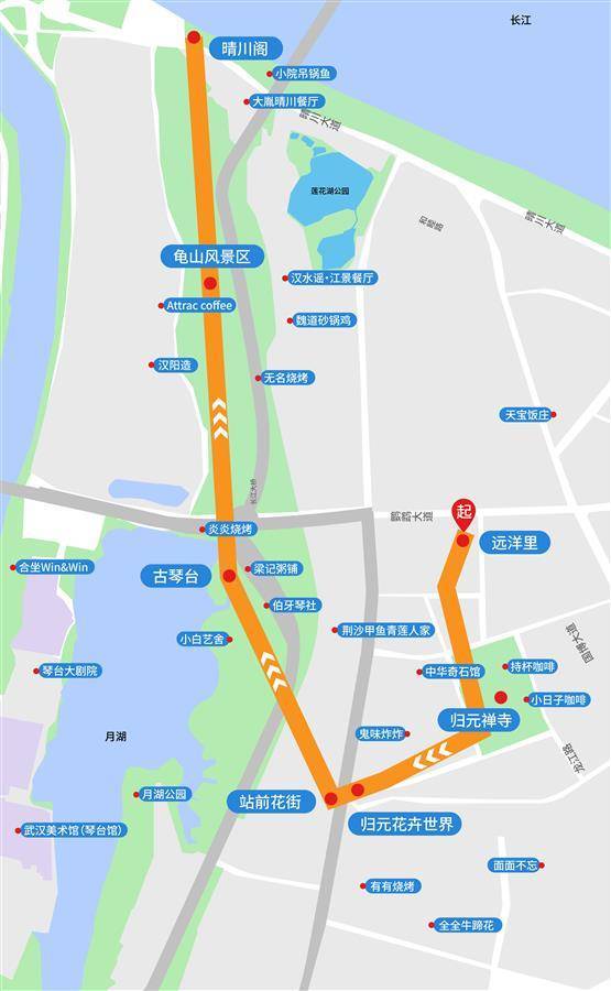 其中,Citywalk深度游路线以远洋里为起点,晴川阁为终点,途经归元禅寺、站前花街、古琴台和龟山风景区。小众花海骑行道路线,则串起汉江湾花田花海、汉水江滩、汉水公园,为游客带来一条宝藏游玩路线。