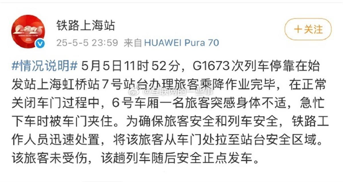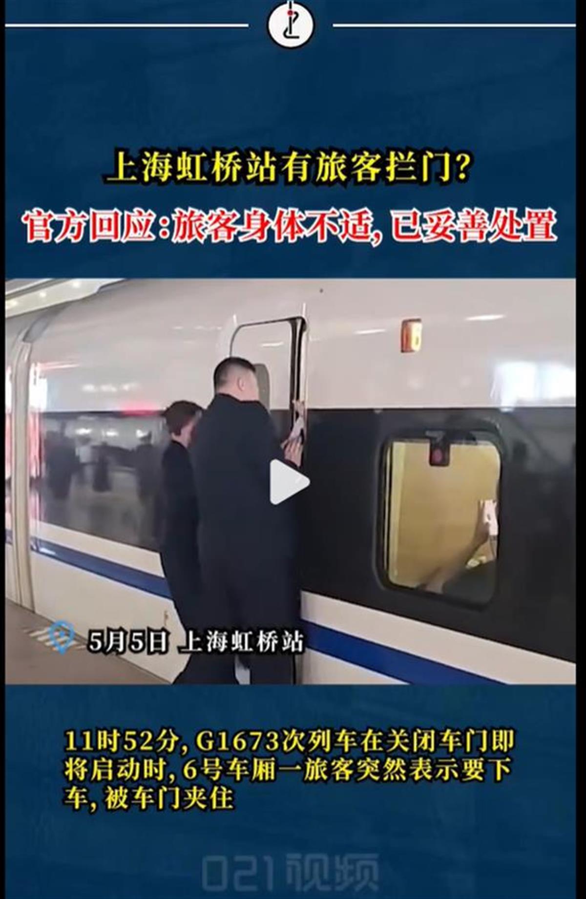 5月6日,微博@铁路上海站通报回应此事称:5月5日11时52分,G1673次列车停靠在始发站上海虹桥站7号站台办理旅客乘降作业完毕,在正常关闭车门过程中,6号车厢一名旅客突感身体不适,急忙下车时被车门夹住。为确保旅客安全和列车安全,铁路工作人员迅速处置,将该旅客从车门处拉至站台安全区域。该旅客未受伤,该趟列车随后安全正点发车。