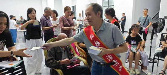 场景三:民宿集中点,雷红兵带领“乡村振兴法务学院”工作人员和法宣服务志愿者给外地游客赠送“法律明白人”手册。