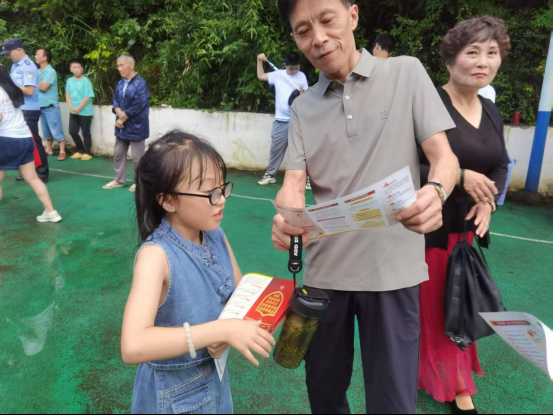 场景二:网红打卡点栏堰锦御园内雷红兵组织法宣服务志愿者给武汉游客发放国家安全知识宣传单。