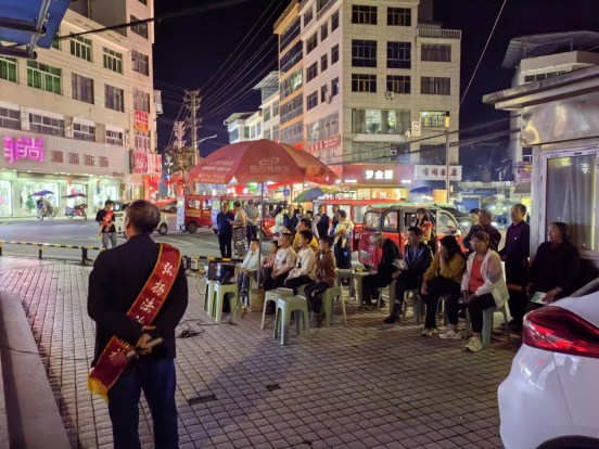 场景四:柏杨坝集镇,雷红兵为外地游客和本地居民播放法治短视频和讲解反电诈、反邪教知识。