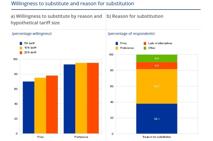 文章还指出,一般来说,当价格上涨时,低收入者往往不得不重新考虑其购买决策,而高收入者受到的影响较小。然而,欧洲央行的调查数据却呈现出截然不同的结果:收入越高,人们越有可能做出替代选择。这一出人意料的结果或是因为高收入家庭可能更多地受到偏好而非价格因素的影响。这一调查结果表明,持续的国际政治和贸易形势变化可能会导致消费者支出出现重大转变,尤其是对美国产品而言。在当前背景下,消费者对关税上调的反应可能会与标准教科书中的消费模式大相径庭。