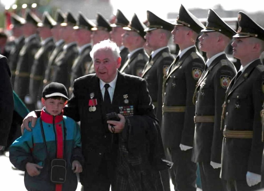 2001年5月9日,在俄罗斯莫斯科,一名老兵带着晚辈参加纪念卫国战争胜利56周年阅兵式。新华社记者王长山摄
