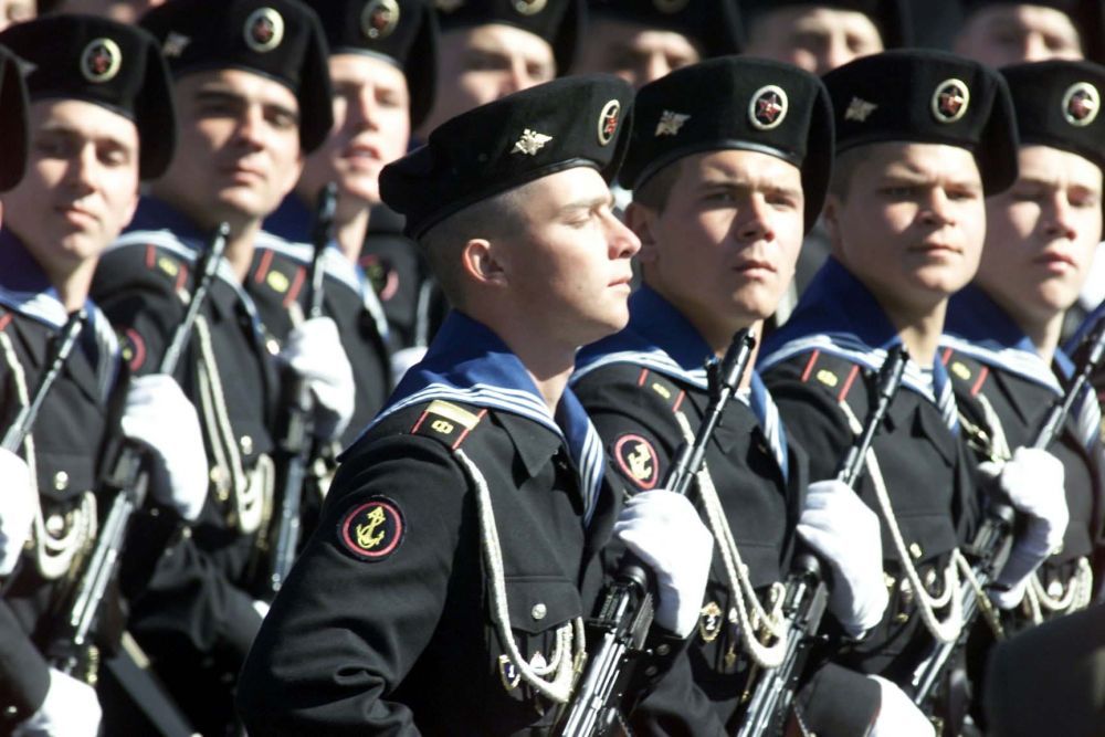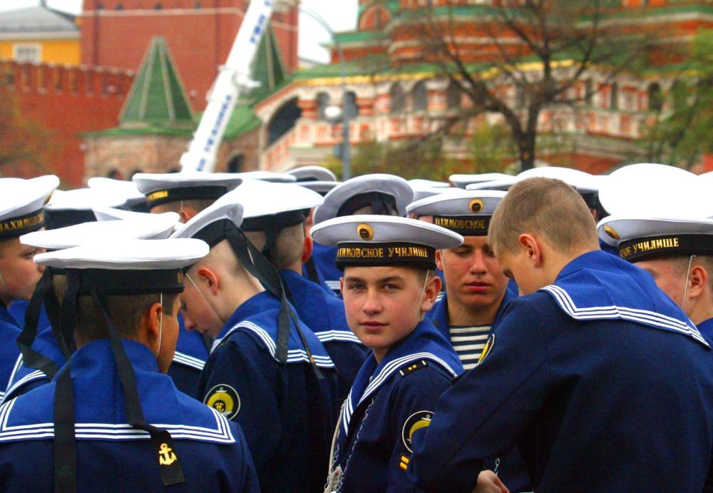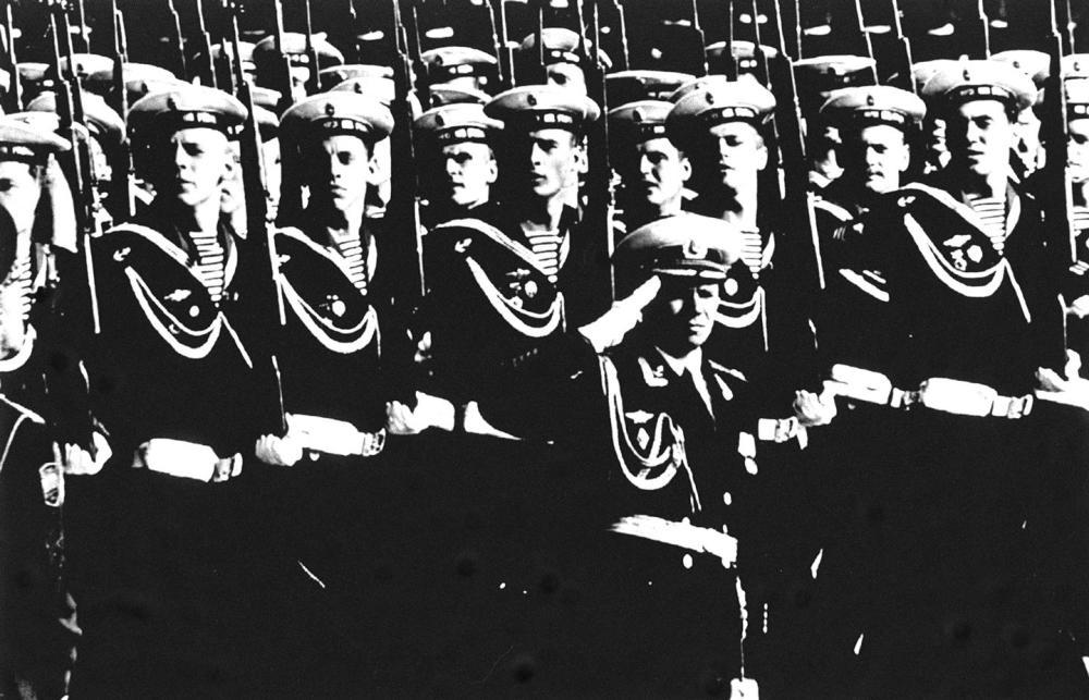 1996年5月9日,在俄罗斯莫斯科红场举行的纪念卫国战争胜利51周年阅兵式上,海军学院的学员们接受检阅。新华社记者 饶爱民 摄