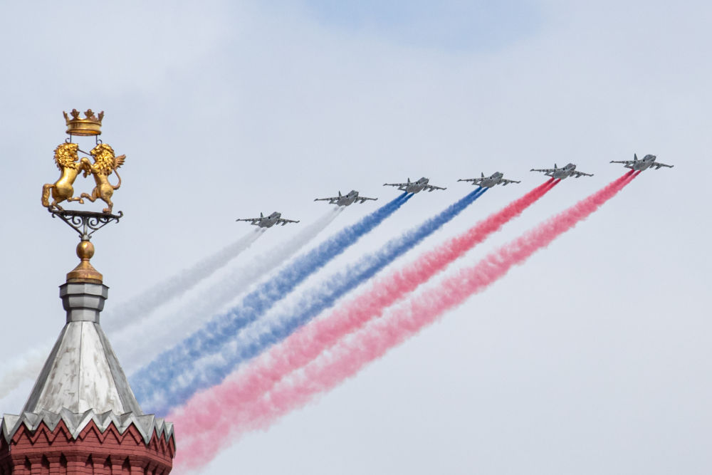2024年5月9日,在俄罗斯莫斯科举行的纪念卫国战争胜利79周年阅兵式上,苏-25攻击机编队飞过红场上空。新华社记者 白雪骐 摄