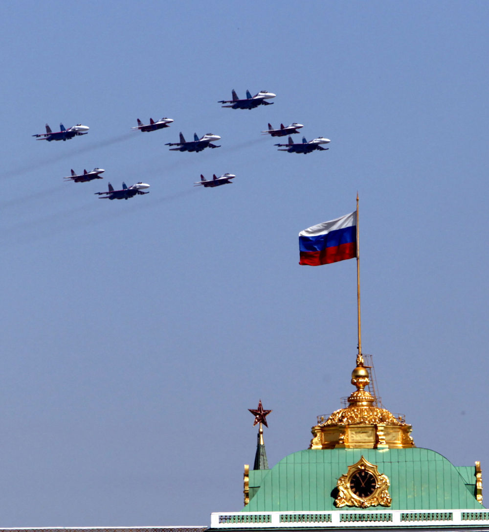 2010年5月9日,在俄罗斯莫斯科举行的纪念卫国战争胜利65周年阅兵式上,战机飞过红场上空。新华社记者 姚大伟 摄