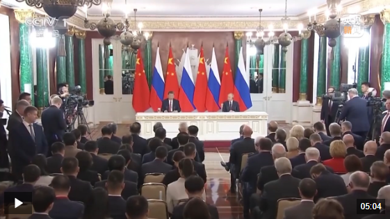 习近平指出,刚才,我同普京总统举行了深入友好、富有成果的会谈,达成许多新的重要共识。我们共同签署《中华人民共和国和俄罗斯联邦在纪念中国人民抗日战争、苏联伟大卫国战争胜利和联合国成立80周年之际关于进一步深化中俄新时代全面战略协作伙伴关系的联合声明》,见证两国有关部门交换多份合作文本,为中俄关系发展注入新的动能。