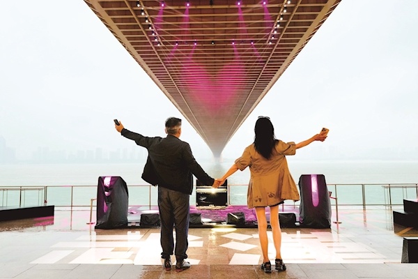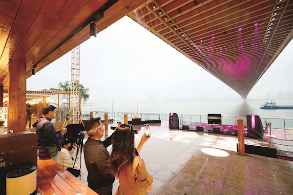 5月8日清晨,武汉杨泗港长江大桥汉阳江滩一侧桥下,由武汉城投城运集团建设的“江影·杨泗港灯光音乐社”项目亮相。钢琴师临水演奏,与灯光、雨瀑和远处江面驶过的轮船共同组成一幅浪漫的画面。据介绍,该项目将于5月20日试运营,届时,这里将融合灯光秀、钢琴演奏、歌手驻唱等特色场景,为市民、游客提供一处开放式公共休闲空间。
