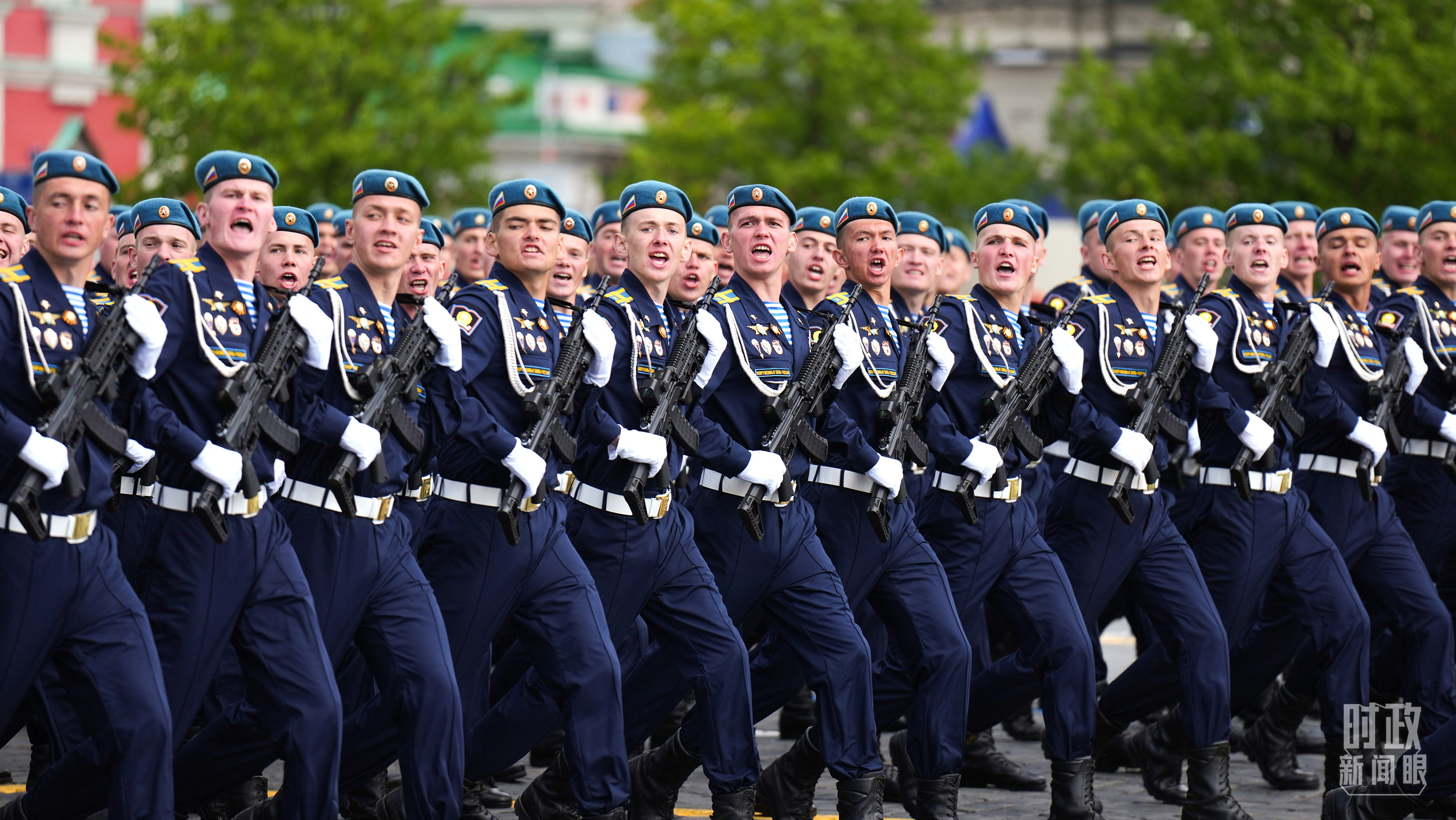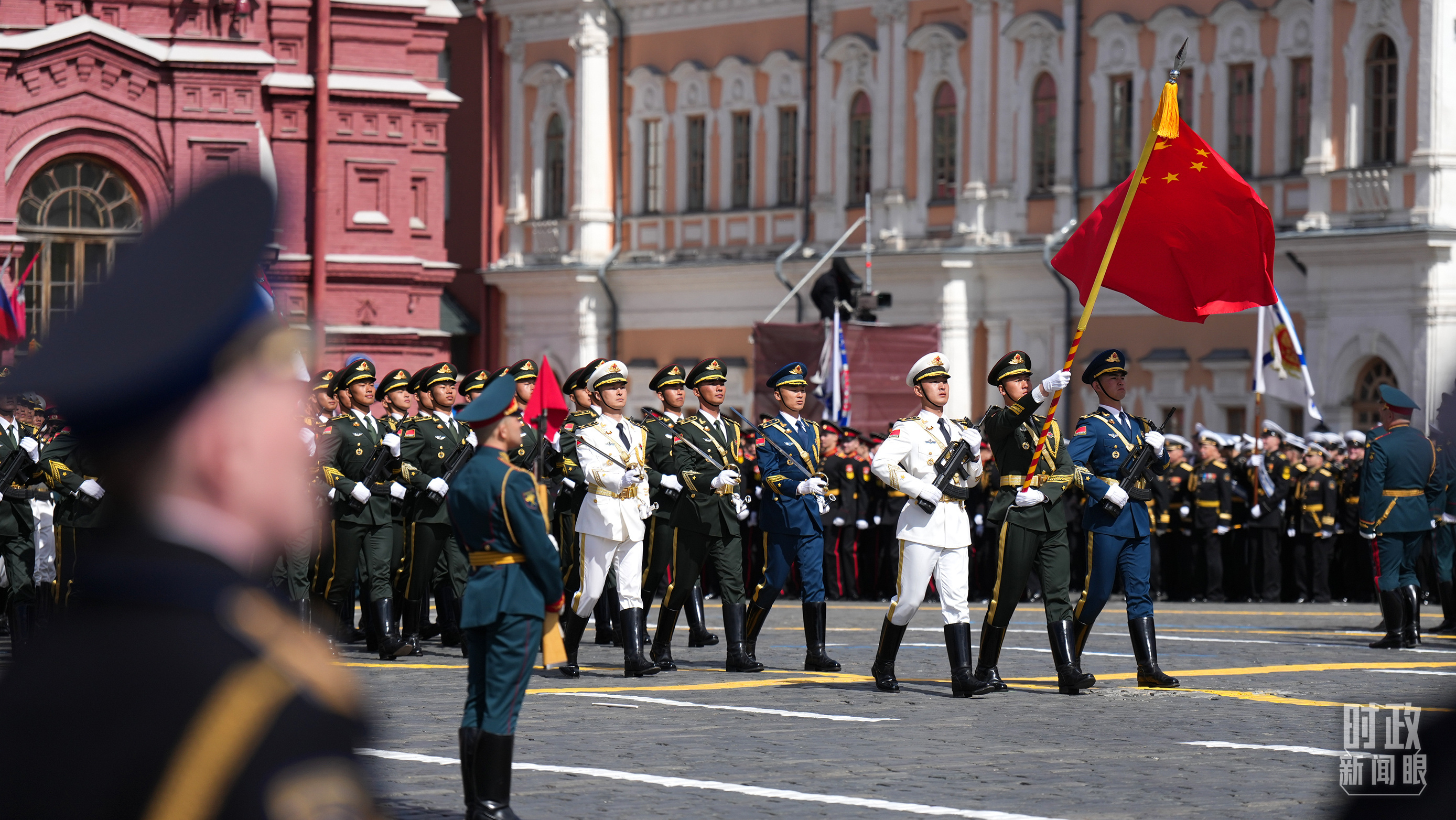 △中国人民解放军三军仪仗队方队军容严整、士气高昂,迈着坚定有力的步伐走过红场。(总台记者李晋拍摄)