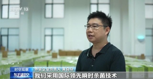 外贸企业负责人 黄良导:我们采用国际领先瞬时杀菌技术,产品营养保留率超95%。截止到今年4月,产品已覆盖全国31个省市,进入大型商超以及多家连锁便利店渠道,合作终端网点30万家,同比增长22.5%。