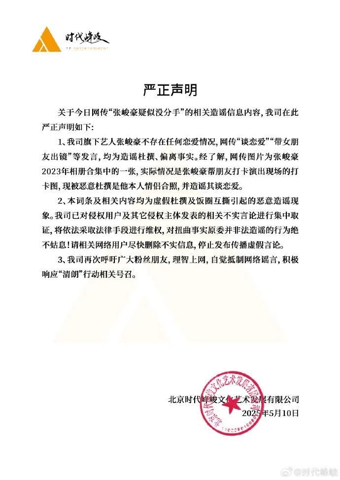 10日,时代峰峻发表声明,称张峻豪不存在任何恋爱情况,网传“谈恋爱”“带女朋友出镜”等发言均为造谣杜撰,本词条及相关内容均为虚假杜撰及饭圈互撕引起的恶意造谣现象,“我司已对侵权用户及其它侵权主体发表的相关不实言论进行集中取证,将依法采取法律手段进行维权,对扭曲事实原委并非法造谣的行为绝不姑息”。