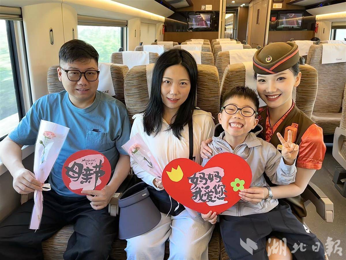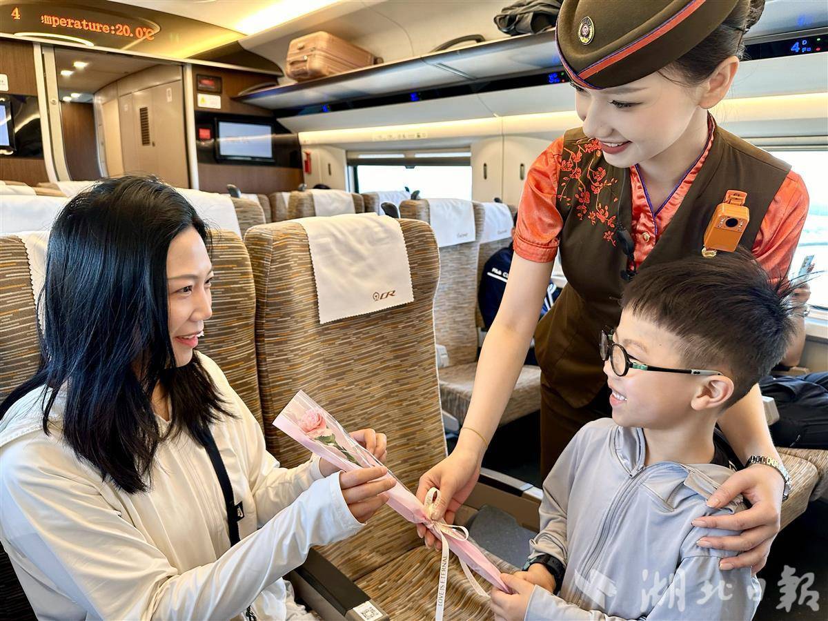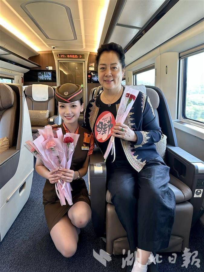 列车启动后,身着制服的乘务人员手捧娇艳的粉色康乃馨,穿梭在各个车厢之间,为乘车的母亲们送上节日的祝福。