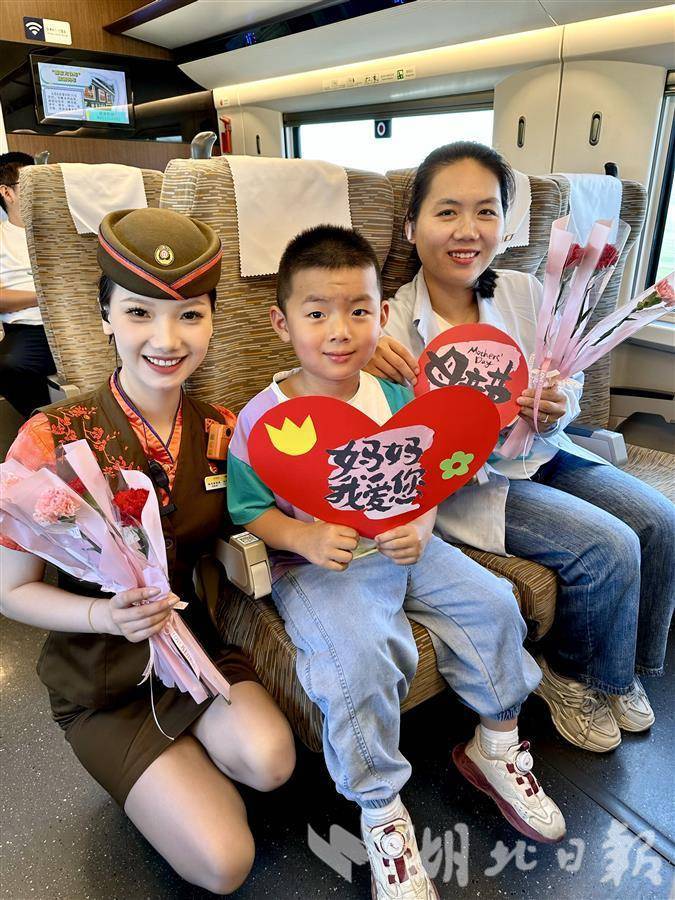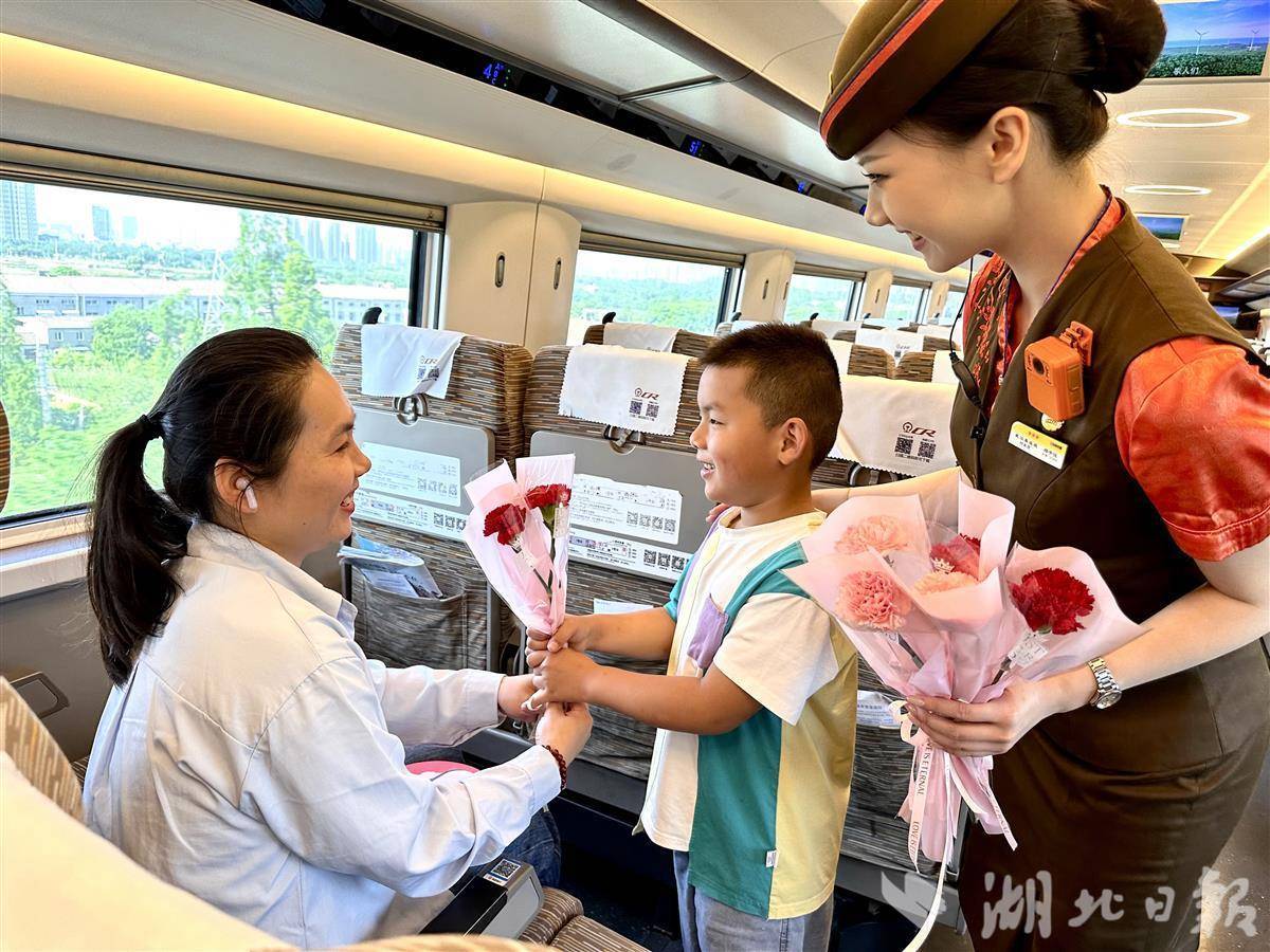5月11日母亲节当天,武汉至宜昌东的D9282次列车上,列车员们开展“感恩母亲节”主题活动,为旅客们带来一段温馨难忘的旅途体验。