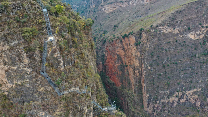 这是通往四川省昭觉县阿土列尔村(悬崖村旧称)的钢梯(2019年11月23日摄,无人机照片)。新华社记者 王曦 摄