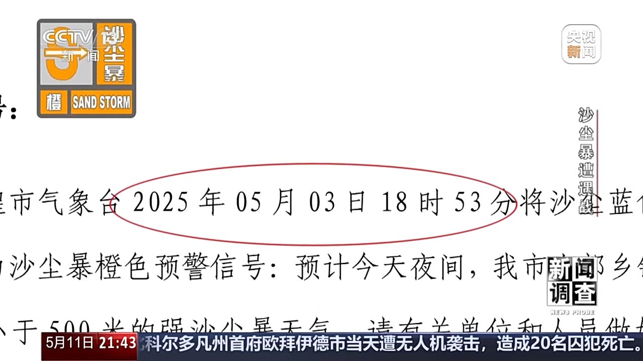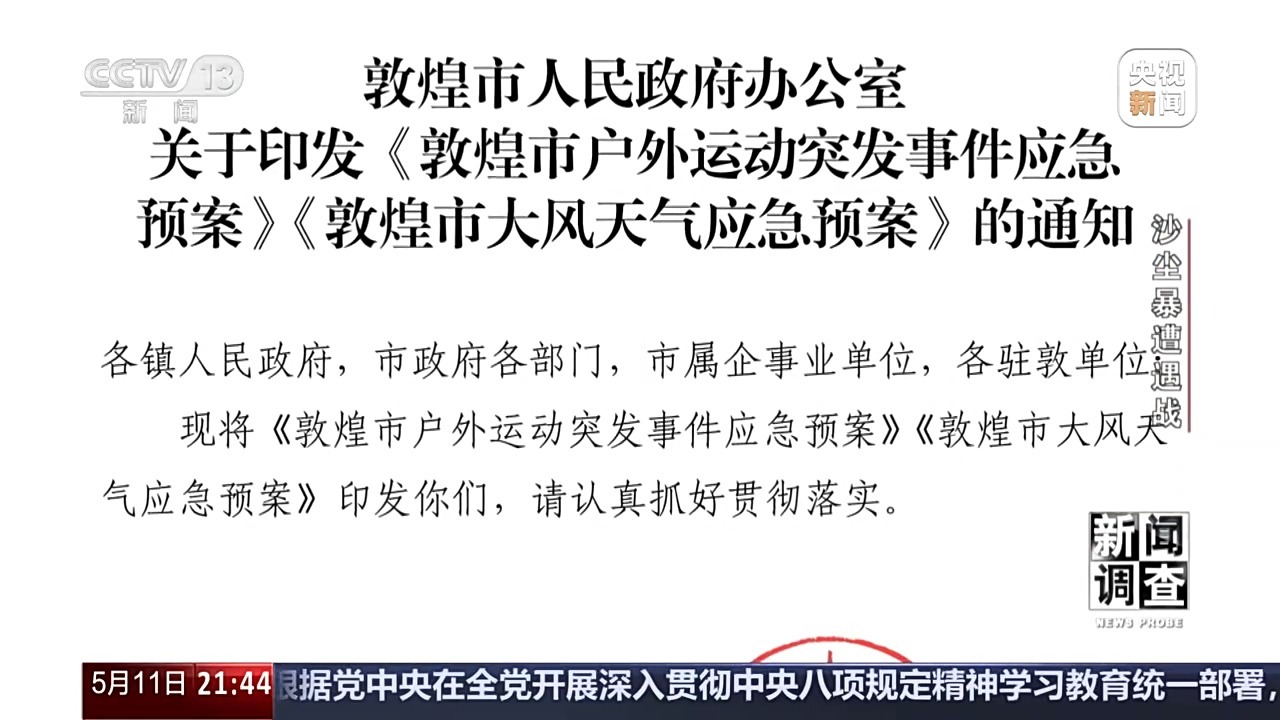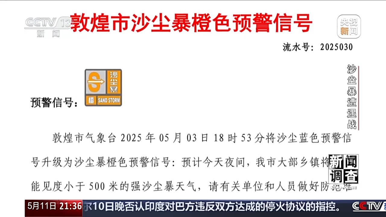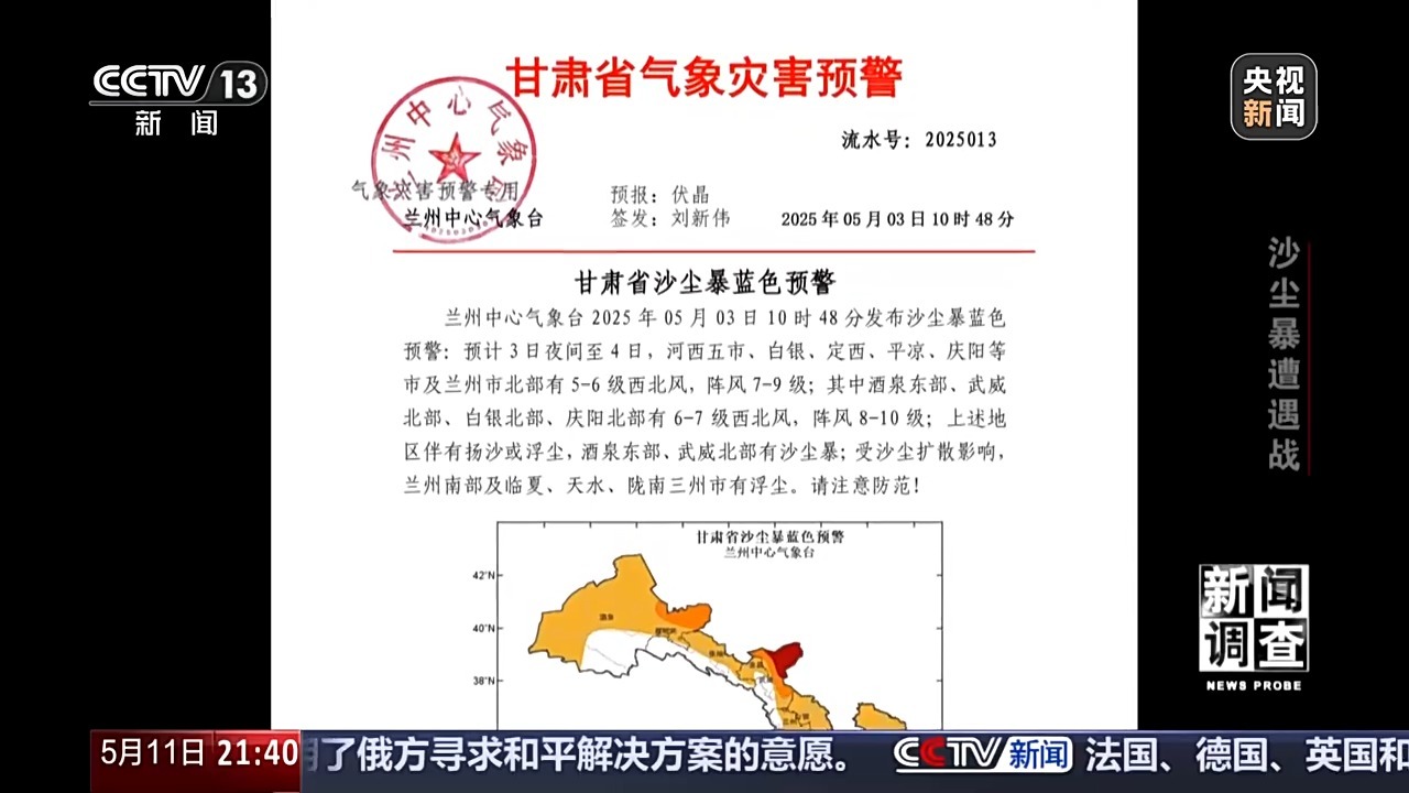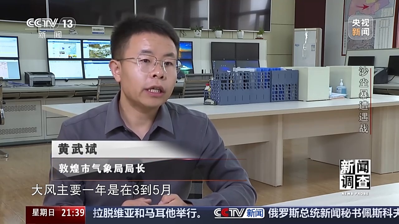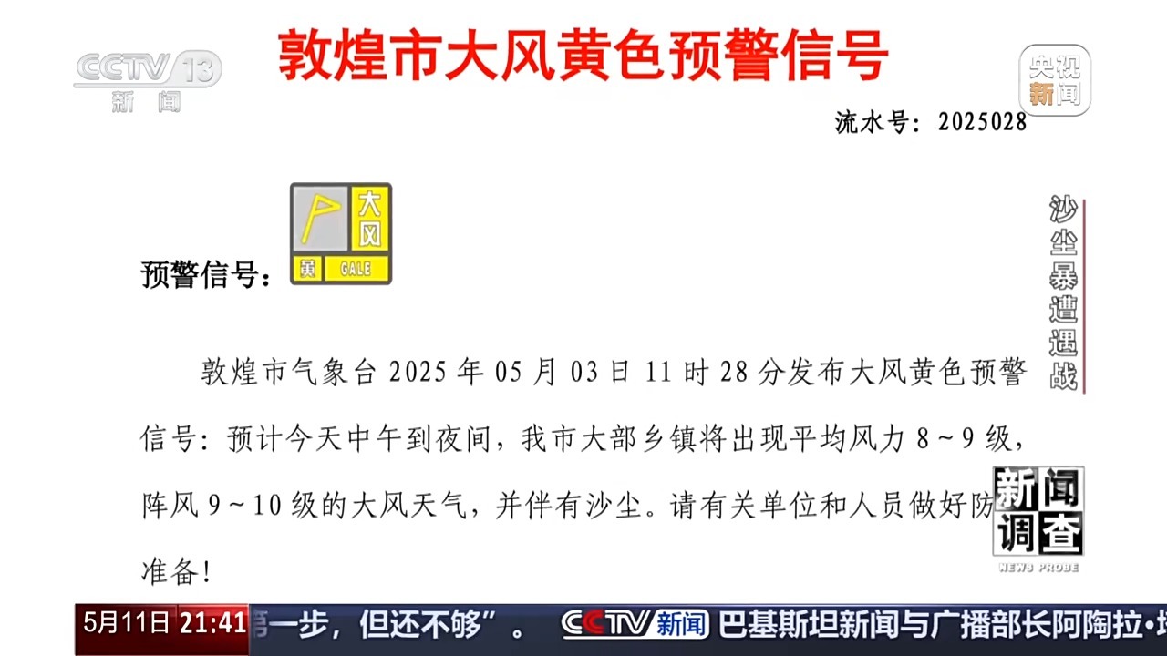 黄武斌是敦煌市气象局局长,他说5月3日上午,甘肃省气象局发布了专题天气预报和沙尘暴蓝色预警,指出“5月3日夜间至4日,我省大部将再次出现大范围的大风沙尘及降温降水天气过程……酒泉东部、武威北部有沙尘暴”。