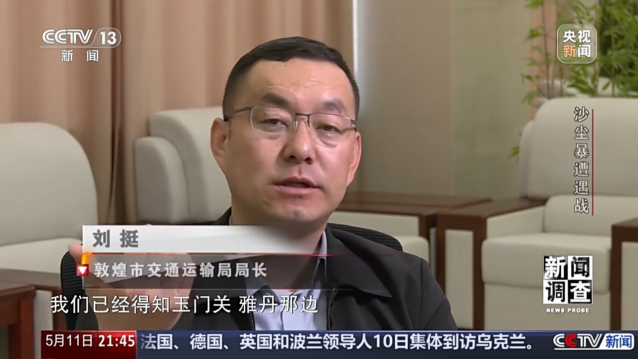 敦煌市交通运输局局长 刘挺:5点多不到6点的时候,因为我们已经也得知这个就是西边,我们玉门关、雅丹那边,西边已经开始刮沙尘。我是通过朋友圈,包括我们有这个交通公司的,他们已经在发微信,他们已经发了视频、小视频,那会就是正常市区,就是一些扬沙、沙尘这种,没到沙尘暴这个级别。然后我们这边也已经有考虑,就是说可能这边也会面临沙尘暴的问题。公交公司也提前有预判,说有车辆,我们先去景区门口等着。当然了我们是生活经验,然后当然没那天没想到沙尘暴会那么大,就是说这个可能比我们预想的要大一些。我跟那个公交公司的负责人,我们电话进行沟通。他也说我看到那边这个已经有人在发视频,这个风比较大,他也已经考虑说让我们车先上去一部分,因为我们的公交车等于是完全停运,在晚上之后,晚上8点半之后才会停运,但是也有一些,就是我们备用的几辆车已经考虑让先过去了。