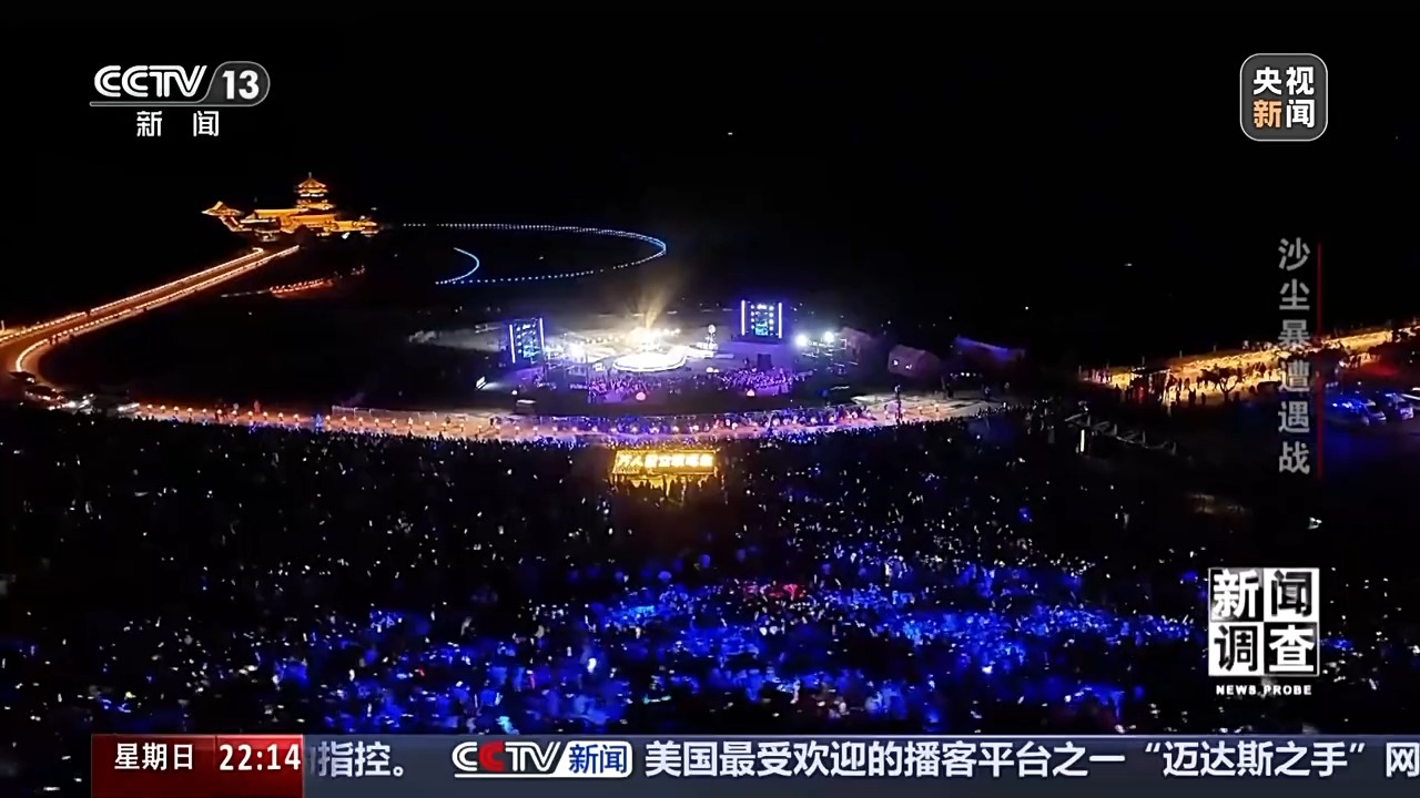敦煌市大景区管委会主任 王志明:万人星空演唱会是2023年在旅游逐步升温的过程中,游客们自发的,在山上他带个小音箱,带个这个小的,这个拍摄的东西他一开始聚个十几个人,结果后面唱着唱着规模越来越大,聚到几十个上百人跟上,就待在那唱,后面山上坐着唱。我们的工作人员也很用心,发现之后就跟中心管委会的领导商量,说我们能不能迎合游客的需求。2024年市委、市政府投了1000多万做了一个改造提升,我们就请专业的设计师把这个音响做了改造提升,在做的那些山上山下的区域几乎可以听到差不多同样的效果。第二,我们采取了一些灯光设计,一下把这个观众席上这种氛围一下就起来了。观众席上彩灯一炫,一下情绪就可以带动起来。第三,我们增加了一些投影设备,观众对面,西边的这个小山坡,把歌词就打到沙坪上面。露天卡拉OK,免费的露天卡拉OK。结果越做这个反响越大,后面我们就请了专业的DJ,2023年可能在最红的时候也就接近万人。但是2024年应该是高峰期,基本上都是万人以上。