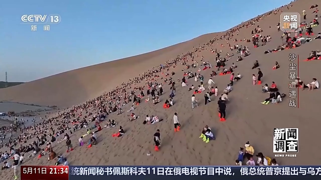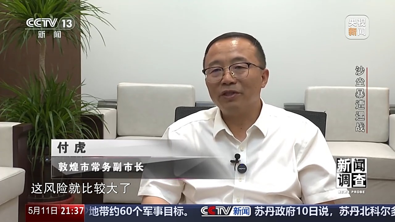 敦煌市常务副市长 付虎:这就风险就比较大了。一个我觉得就是作为外地游客,因为他对这种天气是很少有经历的,虽然当时我们这个沙尘暴前期这个情况出现以后,我们景区也第一时间,我们当时给游客提供免费的口罩、饮用水。但是如果说你说这么大量的游客,近万人的游客,如果在景区滞留下来,确实是一个非常大的风险和隐患,再加上这个月牙泉景区因为它的范围也比较大,地形也比较复杂,所以这里面就会有很多不可预判的风险存在,我们必须以最快的时间和沙尘暴赛跑。