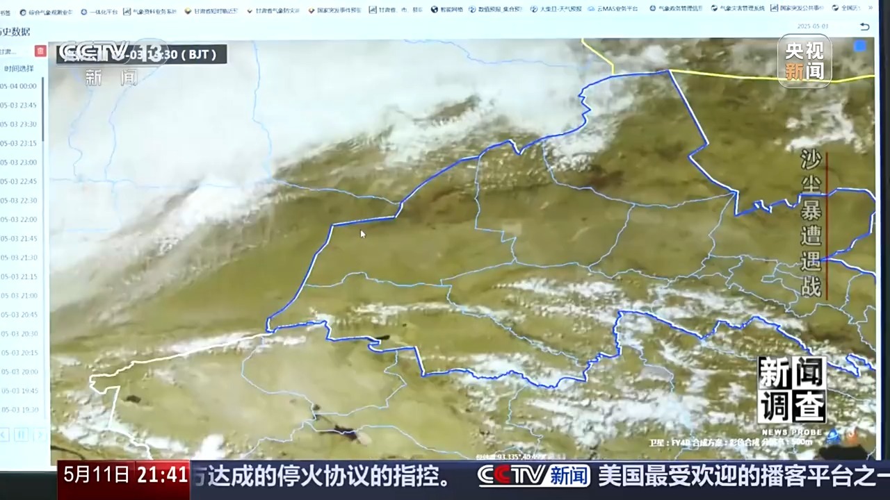 敦煌市气象局局长 黄武斌:在卫星云图上只能看到它上面的一个大概情况,和地面的完全是不一样的,就是它高层沙尘可能很浓,就像敦煌这个,它高层传输过来的沙尘,它高层可能沙尘粒子很大,但是它沉降下来的可能没有那么强。根据卫星云图我们只能说它有沙尘,但是至于能见度或者说沙尘浓度有多少,我们确实不好判断。