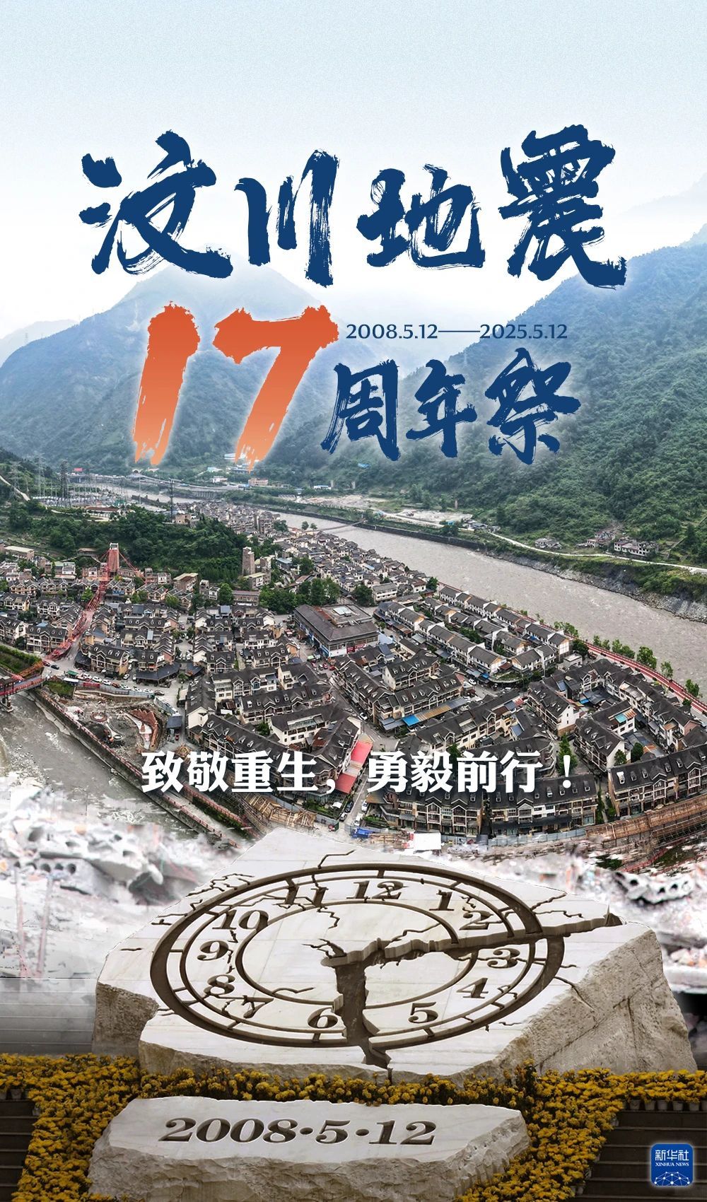 2008年5月12日14时28分四川汶川发生8.0级地震那一刻山河呜咽、满目疮痍大地剧烈震颤灾难吞没了美丽的山川摧毁了千万个曾经幸福美满的家庭无数生命戛然而止整个中华大地浸满悲恸……彼时的哀伤、痛楚我们不会忘记苦难中的温暖、勇气支撑我们继续前行岁月抚平伤痕也记录新生十七载春秋崭新的汶川向阳而生此刻我们缅怀逝去的同胞更铭记危急时刻的生死救援绝境之中的风雨同舟今天致敬重生勇毅前行(策划:宋君毅、李瑜;作者:周喆、张海磊;设计:马发展)