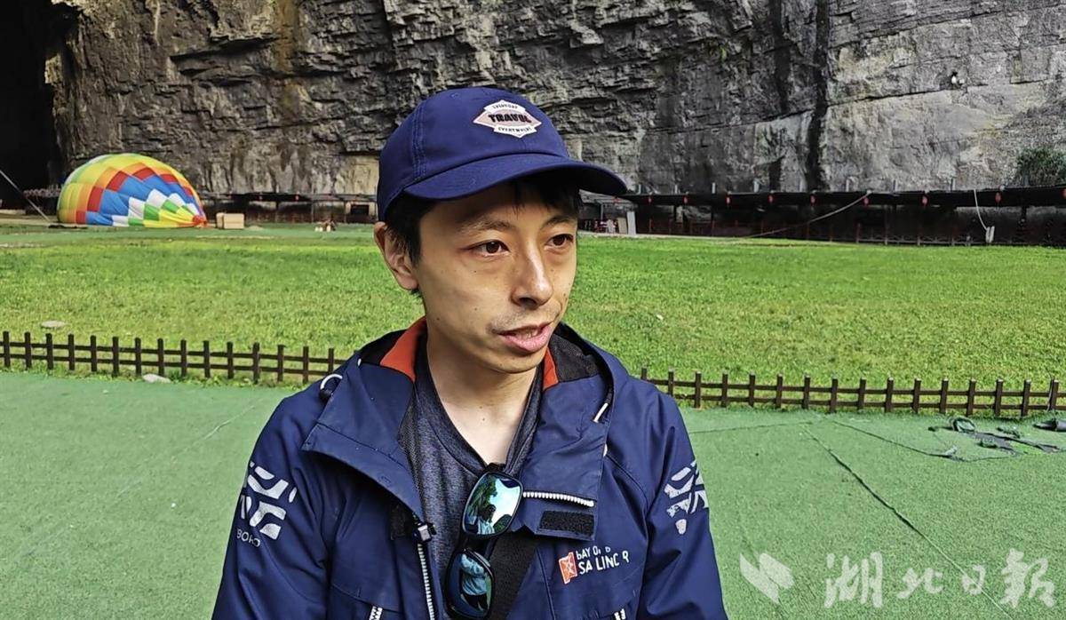 塞内加尔《南方日报》社会环境版记者法图·迪亚耶正在记录腾龙洞美景。(湖北日报全媒记者 沈早慧 摄)