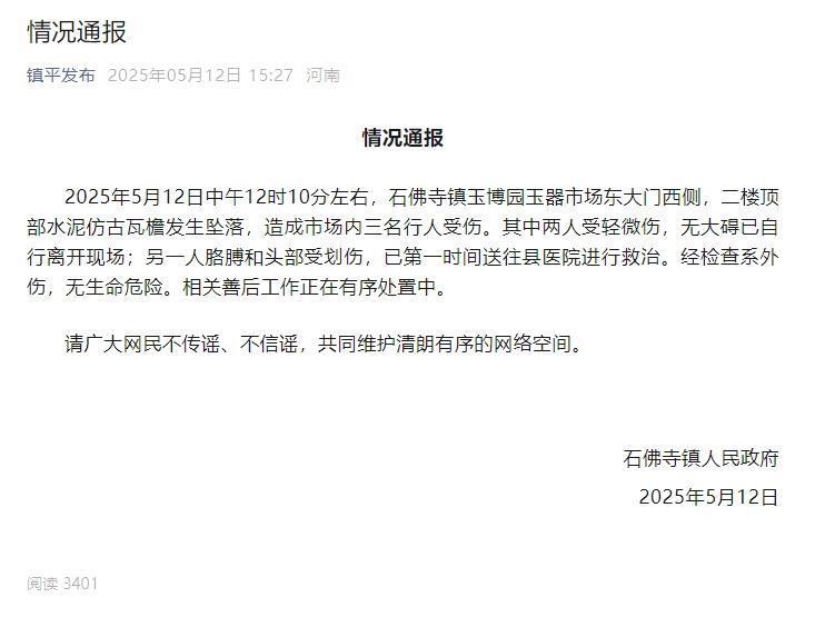 另外,微信公众号“镇平发布”12日发布的情况通报称,2025年5月12日中午12时10分左右,石佛寺镇玉博园玉器市场东大门西侧,二楼顶部水泥仿古瓦檐发生坠落,造成市场内三名行人受伤。其中两人受轻微伤,无大碍已自行离开现场;另一人胳膊和头部受划伤,已第一时间送往县医院进行救治。经检查系外伤,无生命危险。相关善后工作正在有序处置中。