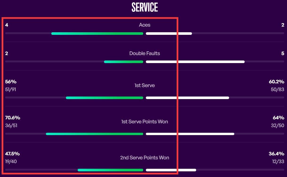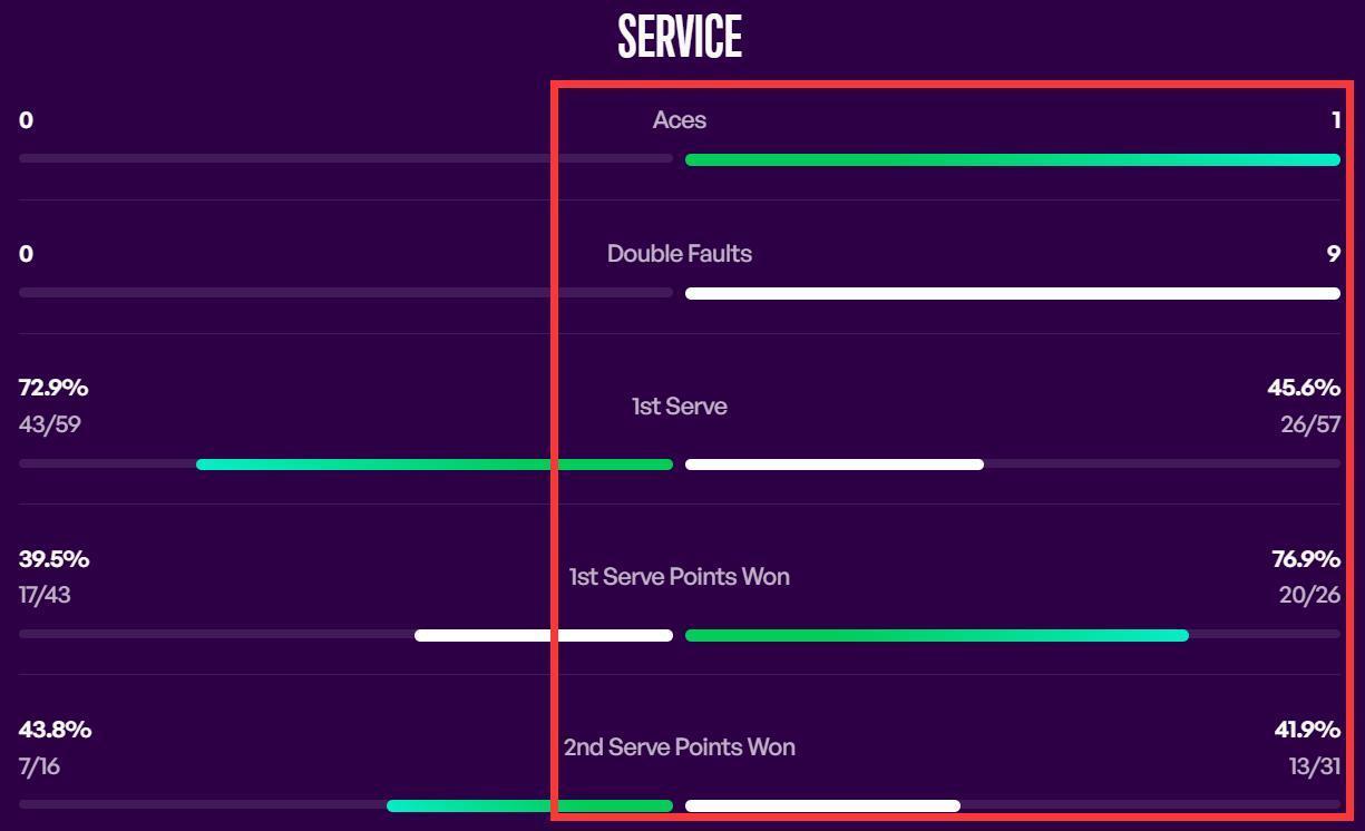 郑钦文的发球数据为:一发成功率45.6%,一发得分率76.9%,二发得分率41.9%,全场发出ACE球1记,发球双误则多达9个。