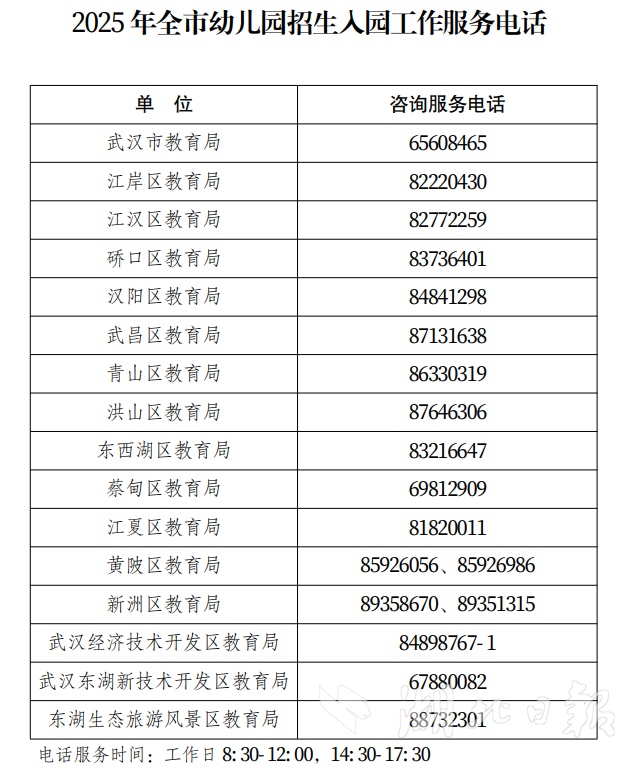 湖北日报讯 (记者张倩倩)5月13日,武汉市教育局官网发布关于做好2025年全市幼儿园招生入园工作的通知,明确6月1日至10日,武汉市各幼儿园对外发布招生公告,包括幼儿园办园基本情况、招生计划、招生范围、招生条件、招生工作流程、收费项目及标准、咨询方式、报名结果查询方式等信息。