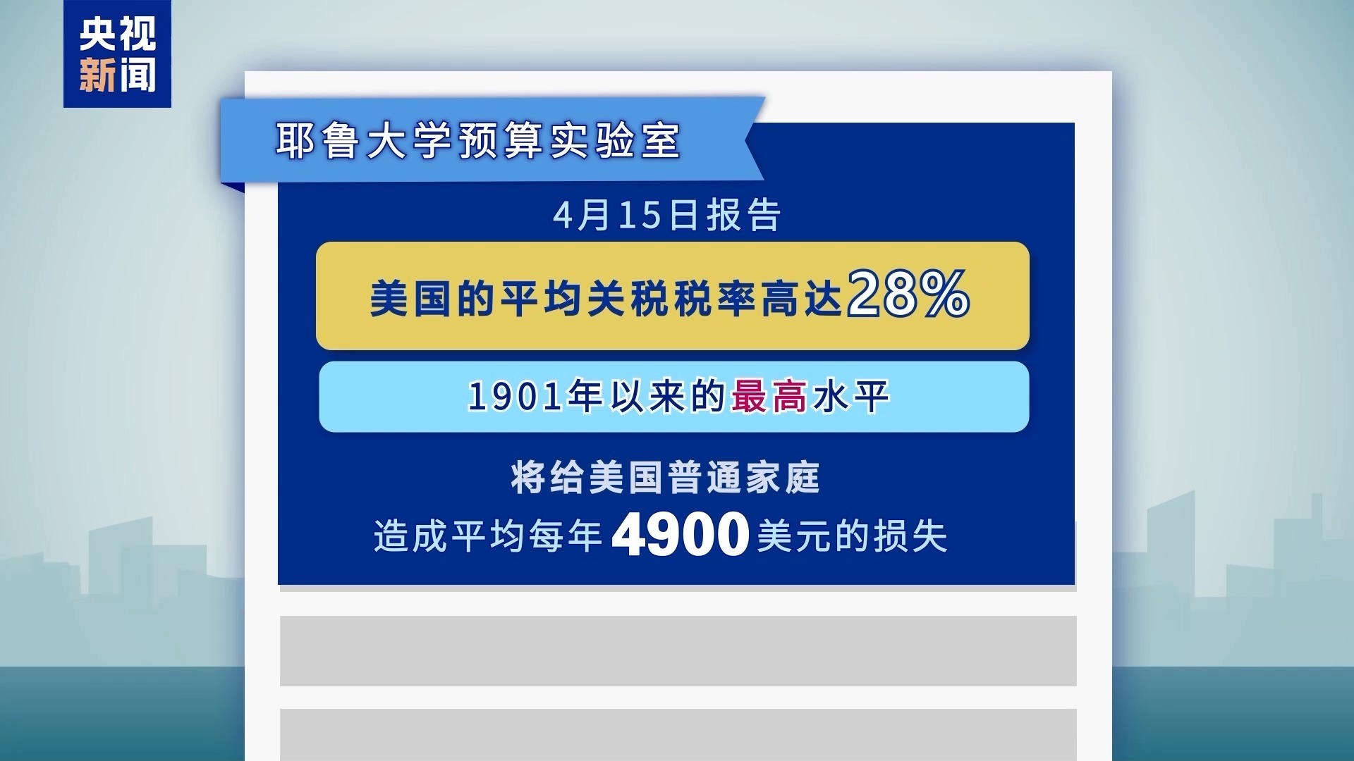 4月15日,在美国与中国、英国达成协议前,耶鲁大学预算实验室也曾发布过一份报告。这份报告称,美国的平均关税税率当时高达28%,为1901年以来的最高水平。按照当时的关税税率,将给美国普通家庭造成平均每年4900美元的损失。