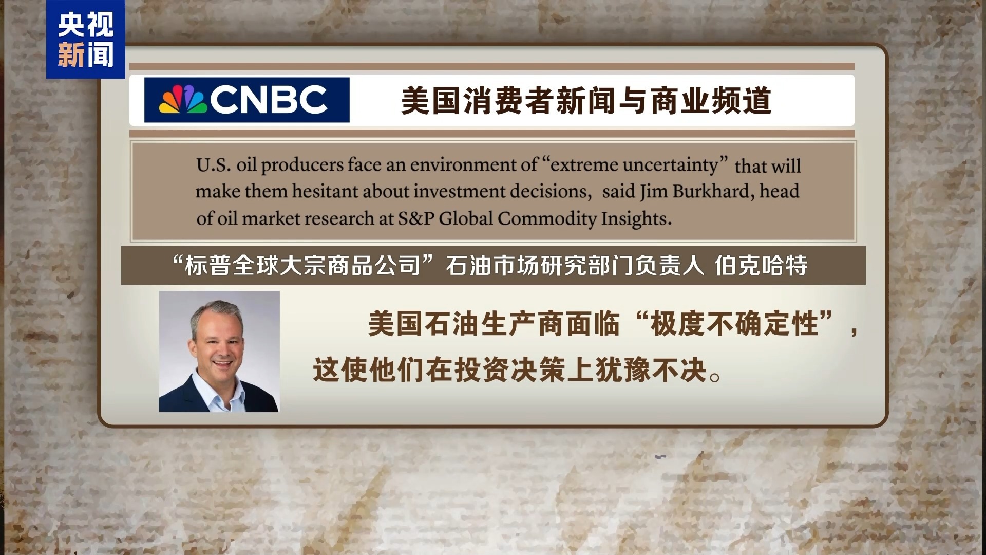 美国消费者新闻与商业频道援引“标普全球大宗商品公司”石油市场研究部门负责人伯克哈特的话报道称,美国石油生产商面临“极度不确定性”,这使他们在投资决策上犹豫不决。