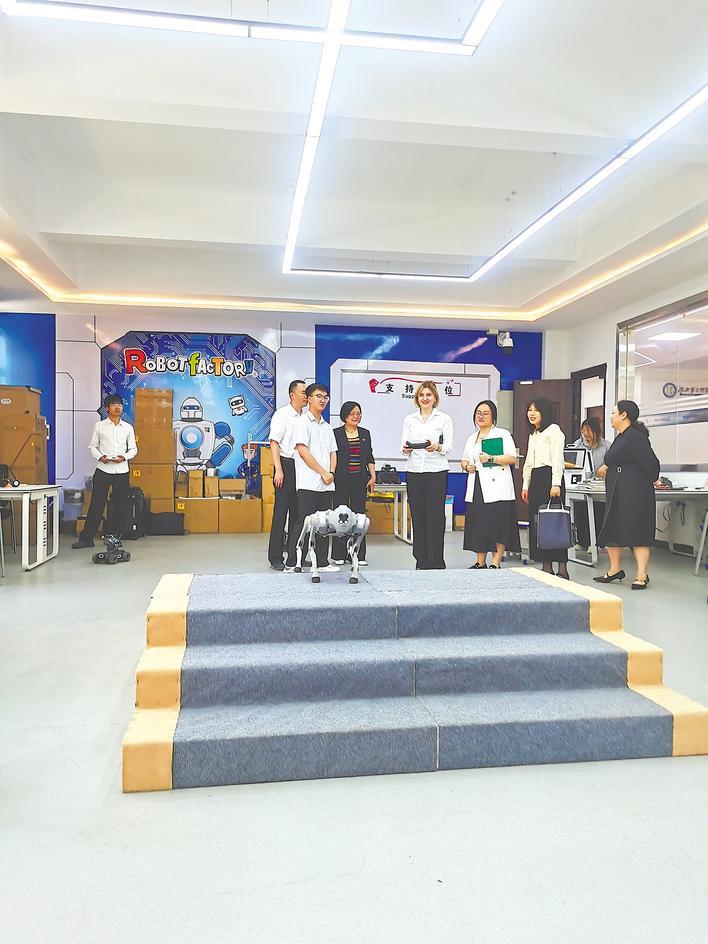 5月12日下午,巴娅·克维茨亚尼女士(右一)到湖北第二师范学院访问,现场体验操作机器人。 (湖北日报全媒记者 包东喜 摄)