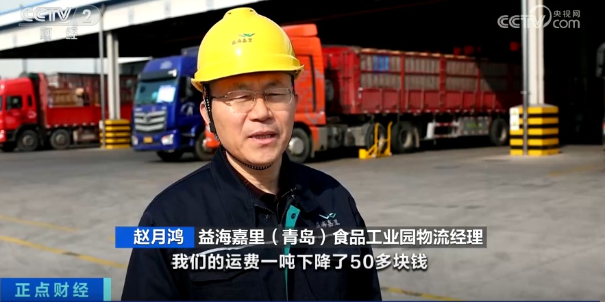益海嘉里(青岛)食品工业园物流经理 赵月鸿:换成了铁路之后,我们的运费一吨下降了50多元,销量也比原来有了明显增长,我们的市场占有率也在逐渐提升。