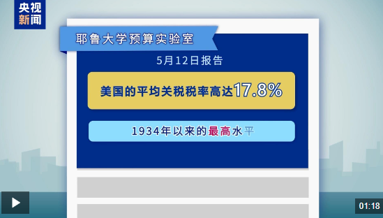 报道援引耶鲁大学预算实验室5月12日发布的报告说,即便在美国与中国、英国达成协议之后,美国的平均关税税率仍然高达17.8%,这是1934年以来的最高水平。这比特朗普第二任期就职前的平均关税税率增加了15.4个百分点。