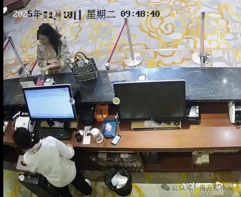 嫌疑人在酒店前台要求退款的公区视频截图。警方供图