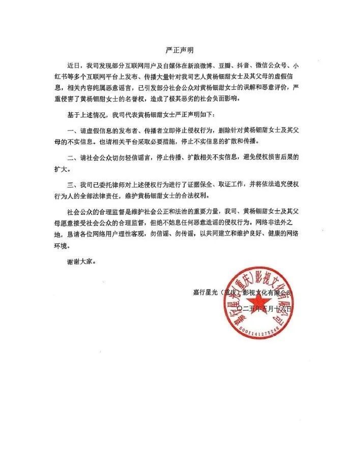 对此,@嘉行传媒 刚刚发布严正声明,呼吁停止造谣等侵权行为,“社会公众的合理监督是维护社会公正和法治的重要力量,我司、黄杨钿甜女士及其父母愿意接受社会公众的合理监督,但绝不姑息任何恶意造谣的侵权行为,恳请大家勿信谣、勿传谣。”