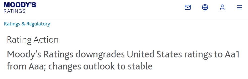 穆迪当日发布公告说,评级下调反映出过去十多年来美国政府债务和利息支付比例升至显著高于拥有类似评级国家的水平。穆迪认为,持续的大规模财政赤字将进一步推高政府债务和利息支出负担。与美国以往以及其他高评级主权国家相比,美国财政状况很可能恶化。