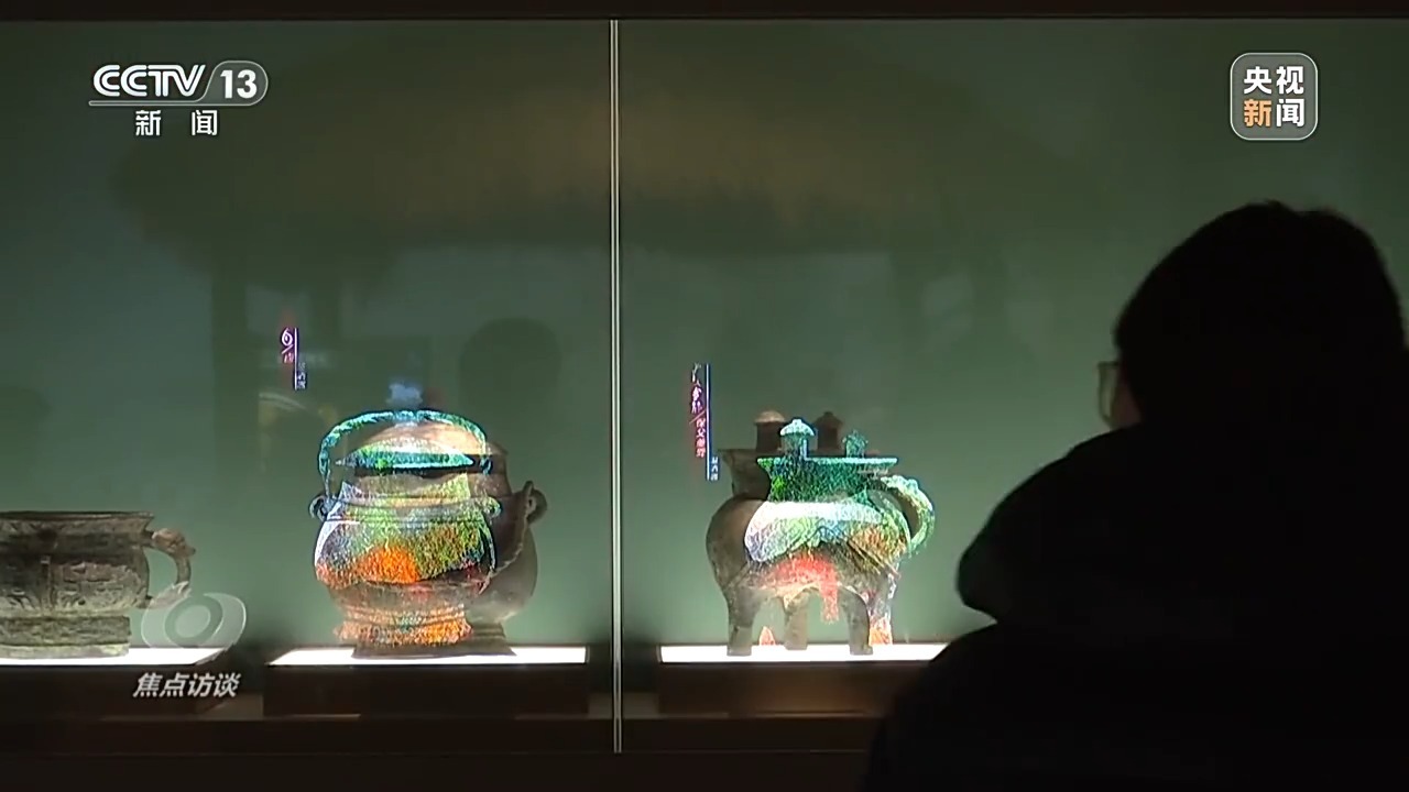 文物展柜上,透明LED屏与数字虚拟影像结合,不仅精准“复刻”对应的青铜器,也让观众得以更直观地了解其形制与用途。在裸眼3D技术加持下,珍贵的文物突破了静态展示的局限。