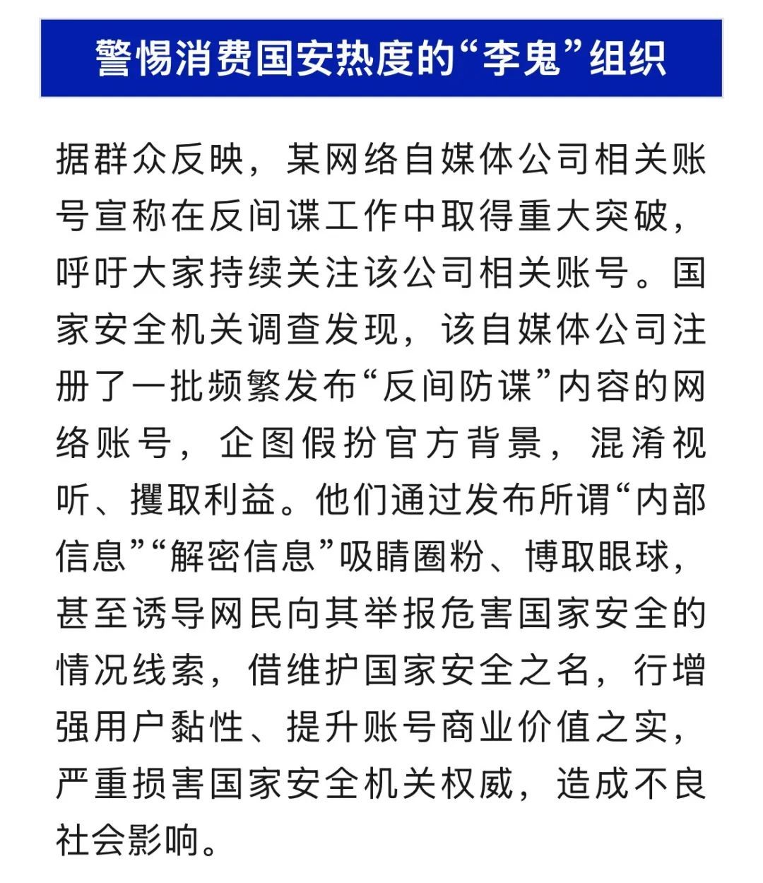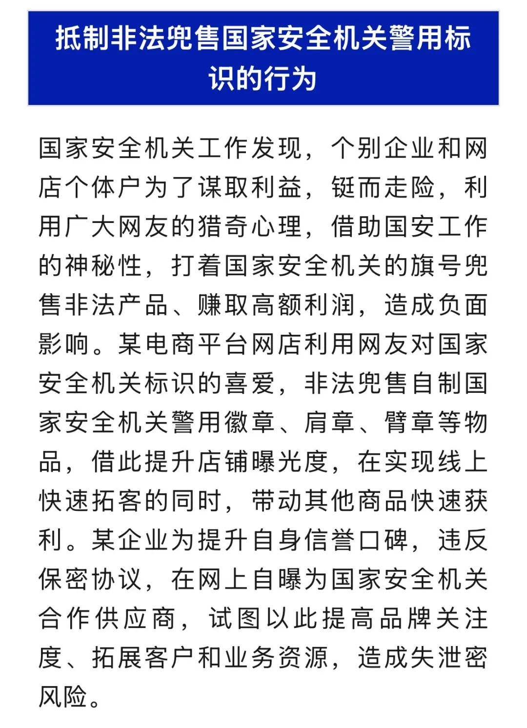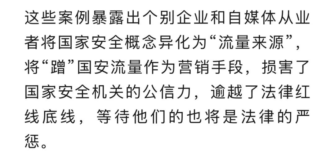 一个时期以来,国家安全机关创新开展国安新媒体工作,面向全社会开展总体国家安全观宣传、国家安全法律法规阐释、国家安全典型案例解析,广大人民群众理解、支持国家安全工作的合力不断汇聚。然而,个别别有用心之人竟从中嗅到了“商机”,试图“蹭”国安热度博取眼球、借机盈利,甚至非法兜售国家安全机关警用标识,干扰国家安全机关工作、影响国家安全机关形象。