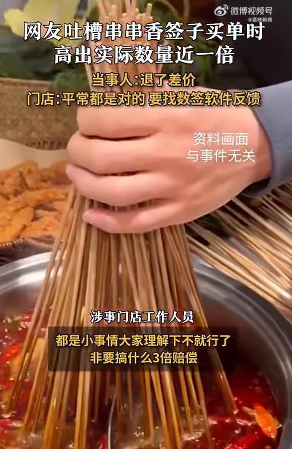近日,有网友发视频称吃串串遇签子收费比实际吃出多一倍,评论中也有顾客反映签子多了,多收钱的问题。
