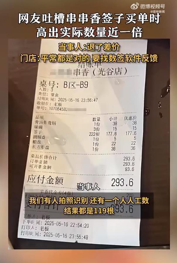 当事人表示,店家在小程序识别后,在收银台手动输入签子数,输入的是222根,自己拍照识别和人工数后都是119根,之后商家退还了差价。