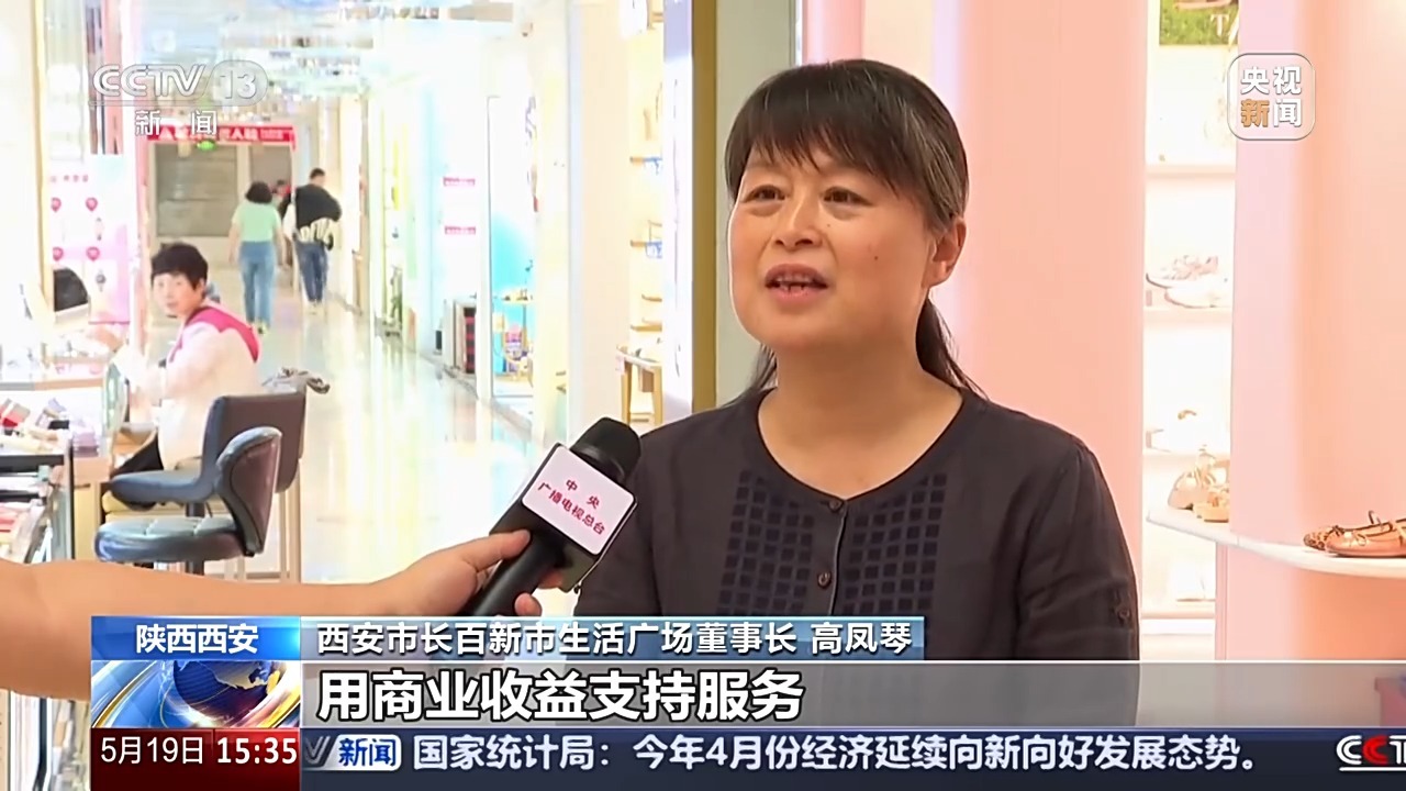 西安市长百新市生活广场董事长 高凤琴:我们构建了公益、服务和销售结合的模式,用商业收益支持服务,同时通过公益服务更加拉近与居民的关系,各个店铺从公益思维出发,从居民真实的需求出发,比如我们提供免费擦鞋、提供给老人免费教智能手机的使用等等,实现客流和消费的持续增长。