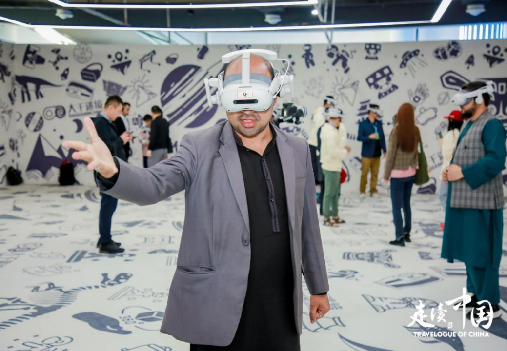巴基斯坦“萨驰新闻”新闻调查组负责人赛义德・奥恩・穆罕默德佩戴VR设备体验互动场景