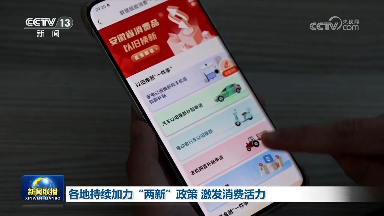 央视网消息(新闻联播):各地持续加力“两新”政策,进一步优化流程、升级服务,激发市场活力,让广大消费者享受到更多实惠。