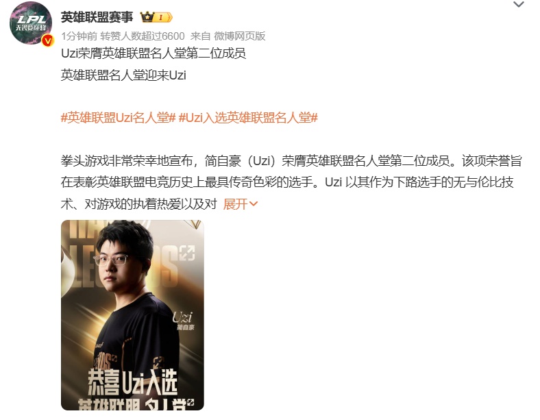 5月19日,@英雄联盟赛事发布消息,宣布Uzi入选英雄联盟名人堂。文中提到,拳头游戏非常荣幸地宣布,简自豪(Uzi)荣膺英雄联盟名人堂第二位成员。