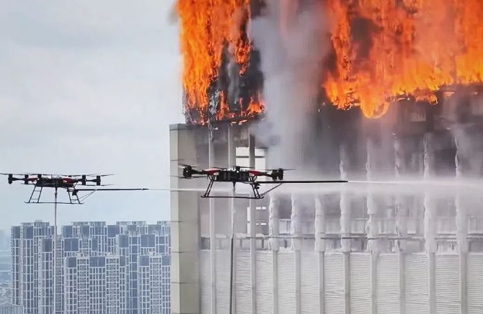 闫怀强:这一架是TD550无人直升机,它载重可以到200公斤。国网很多都需要巡检,比方说高压巡检,以前都是人像走钢丝一样在上面巡查,很危险。现在用这款无人机就可以实现空中巡检。在其他行业,比如说应急消防,一般登高车的喷射距离是八九十米。现在无人机可以带水带水枪直接飞到100米以上,直接就把高层的灭火场景覆盖了。